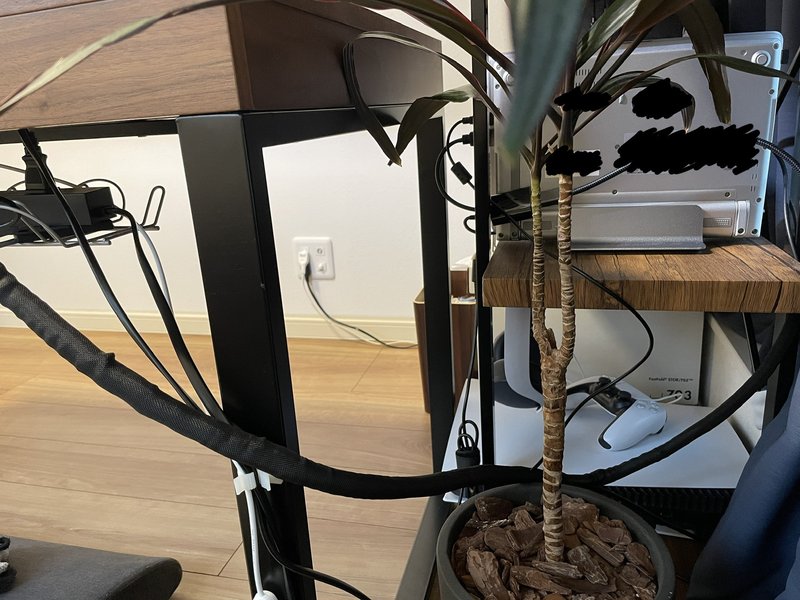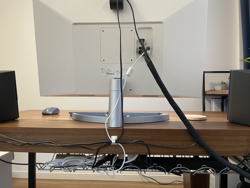 となってます。パソコンやPS5は隣の棚に置いてあるので、ケーブルはまとめて隣まで持って行ってます。