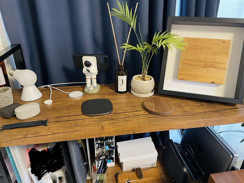 左側に充電スペース。今はAppleWatch、iPhone12mini、iPadmini、AirPodPro、WF-1000XM4をそれぞれ充電してます。もう少し整理したいですね。